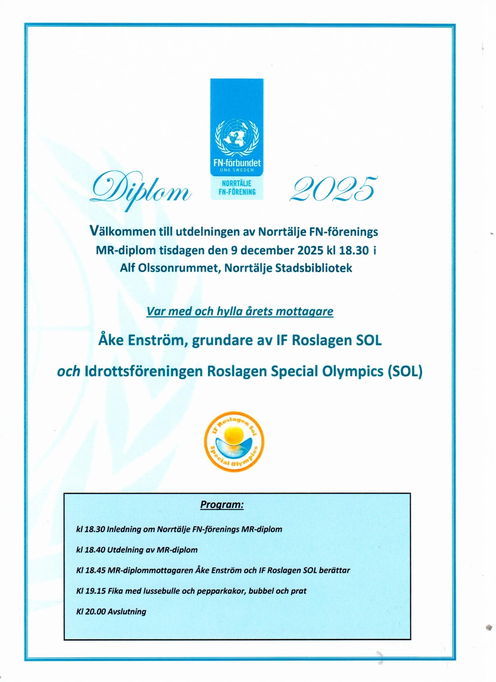 Välkommen till utdelningen av Norrtälje FN-förenings MR-diplom! Var med och hylla årets mottagare Åke Enström, grundare av IF Roslagen SOL och IF Roslagen Special Olympics (SOL)