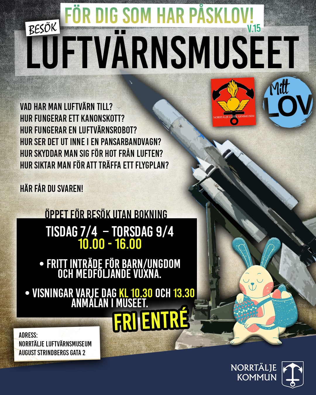 Påsköppet på Norrtälje Luftvärnsmuséum. Fritt inträde barn, unga och medföljande vuxna. Visningar sker varje öppen dag klockan 10:30 och 13:30. Varmt välkomna.