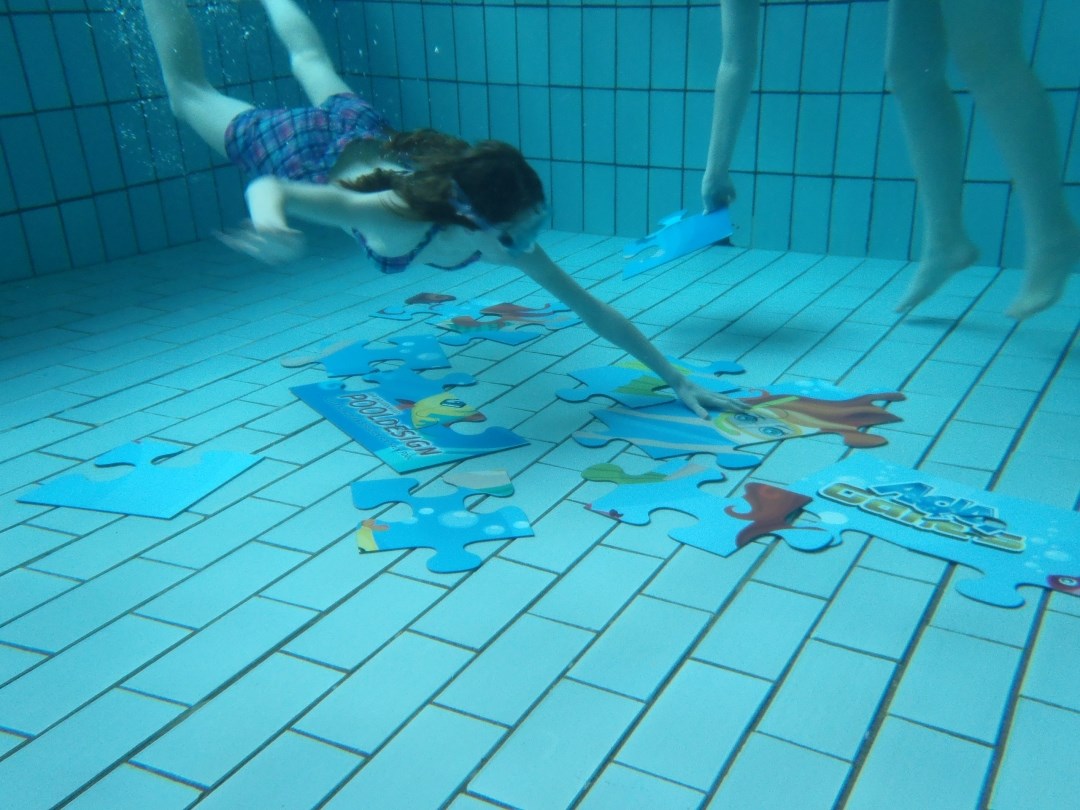 Prova att lägga pussel på botten i 25 metersbassängen på Norrtälje badhus.