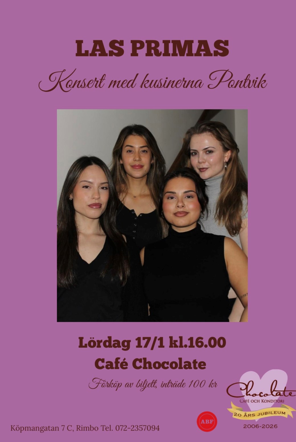 "Las primas" består av kusinerna Natalia Cavalheiro Pontvik, Cynthia Pontvik Lillo, Sofia Pontvik Lillo och Mathilde Refsbäck Pontvik. Den 17 januari 2026 inleder de Café Chocolates 20-årsjubileum med en konsert. Kusinerna kommer från en stor musikalisk familj med bakgrund från Uruguay och musiken har alltid varit en viktig och central del av tjejernas liv. Konserten bjuder på en blandning av soul och lugnare pop som kommer framföras på svenska, spanska och engelska.