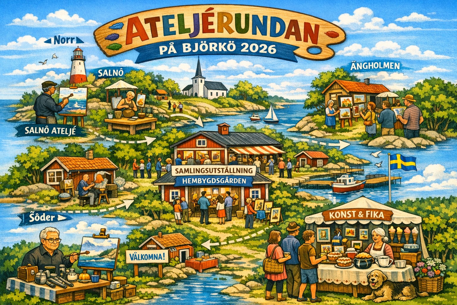 Välkommen till vår artonde ateljerunda med utställningar, försäljning och fika. Dessa dagar kommer konstnärer på Björkö bjuda in för att visa sina alster på utställningar över hela Björkö, från Salnö i norr till Ängholmen i söder och med en samlingsutställning på Hembygdsgården.