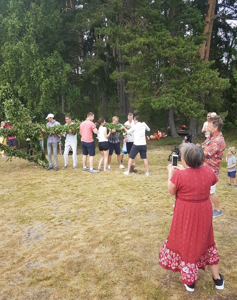 Samling på Ekvallen för att Maja midsommarstången.