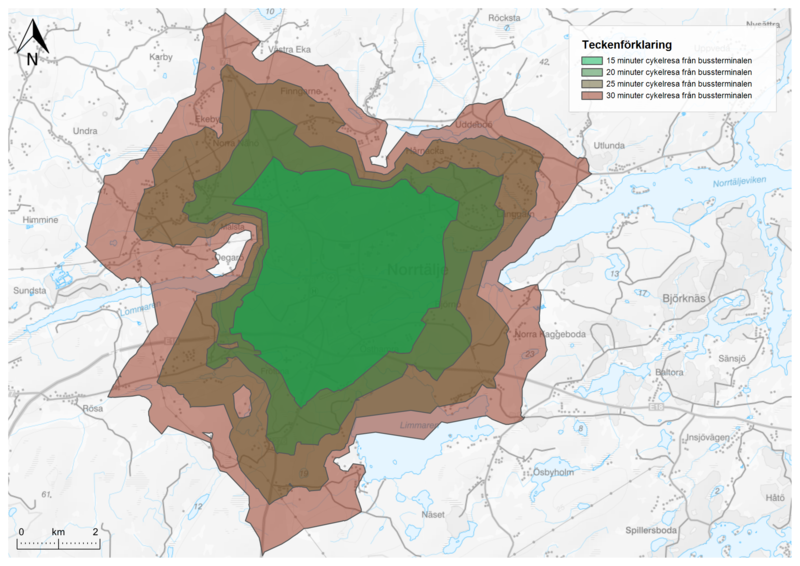 Då anläggningen främsta syfte är som ridskola ska den vara tillgänglig för medlemmar utan att behöva resa med bil. Detta ställer krav på att anläggningen inte får vara på för långt avstånd från staden. I utförd lokaliseringsutredning har en vägnätsanalys utförts för att se till vilka områden det är möjligt att ta sig till med en 15, 20, 25 och 30 minuters cykeltur från Norrtälje busstation. Norrtälje busstation fungerar som en mittpunkt i staden och ger en generaliserad bild av tillgängligheten till olika områden. Anläggningen bör vara tillgänglig inom 15 minuter men områden inom 20 minuter ses även som möjliga.