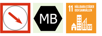 Bild: Tre symboler. Den första symbolen visar en röd pil nedåt vilket innebär att planen bedöms ha negativa konsekvenser för bebyggelse, kulturmiljö och landskap. Symbolen MB indikerar att aspekten finns med i miljöbalken. En symbol visar att aspekten relaterar till det globala målet Hållbara städer och samhällen.