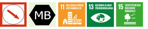 Bild: Fem symboler. Den första symbolen visar en röd pil nedåt vilket innebär att planen bedöms ha negativa konsekvenser för natur. Symbolen MB indikerar att aspekten finns med i miljöbalken. Tre symboler visar att aspekten relaterar till de globala målen Hållbara städer och samhällen, Bekämpa klimatförändringarna samt Ekosystem och biologisk mångfald.
