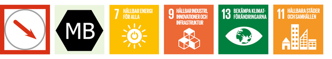 Bild: Sex symboler. Den första symbolen visar en röd pil nedåt vilket innebär att planen bedöms ha negativa konsekvenser för klimatpåverkan. Symbolen MB indikerar att aspekten finns med i miljöbalken. Fyra symboler visar att aspekten relaterar till de globala målen Hållbar energi för alla, Hållbar industri, innovationer och infrastruktur, Bekämpa klimatförändringarna samt Hållbara städer och samhällen.