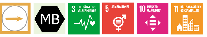 Bild: Sex symboler. Den första symbolen visar en grön pil uppåt vilket innebär att planen bedöms ha positiva konsekvenser för hållbart vardagsliv och levande samhällen. Symbolen MB indikerar att aspekten finns med i miljöbalken. Fyra symboler visar att aspekten relaterar till de globala målen God hälsa och välbefinnande, Jämställdhet, Minskad ojämlikhet samt Hållbara städer och samhällen.