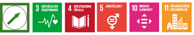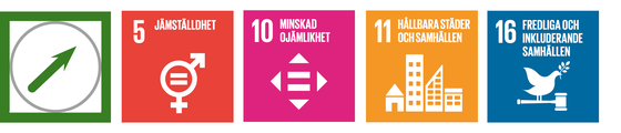 Bild: Fem symboler. Den första symbolen visar en grön pil uppåt vilket innebär att planen bedöms ha positiva konsekvenser för trygghet och tillgänglighet. Fyra symboler visar att aspekten relaterar till de globala målen Jämställdhet, Minskad ojämlikhet, Hållbara städer och samhällen samt Fredliga och inkluderande samhällen.