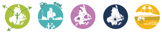 Bild: Fem symboler som motsvarar översiktsplanens fem strategier. Strategierna visar ett förhållningssätt till kommunens utveckling på en översiktlig nivå.