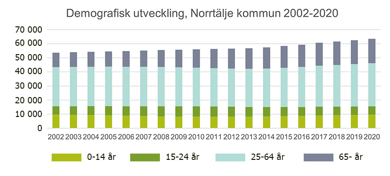 Andelen äldre har ökat i Norrtälje kommun de senaste 50 åren. Av diagrammet framgår det att kommunen sedan 1970 framför allt har ökat i de äldre åldrarna. En utveckling som förstärkts sedan år 2000. Medelåldern i Norrtälje kommun var 46 år 2022 vilket är den högsta av alla kommuner i Stockholm län. Den genomsnittliga medelåldern i Stockholms län var 39,9 år samma år. 1970 var andelen av befolkningen över 65 år 18 % av totala befolkningsmängden. 2022 var andelen av befolkningen över 65 år 28 % av totala befolkningsmängden. Andelen invånare i förvärvsarbetande ålder (25-64 år) var både 1970 och 2022 48 % av befolkningsmängden för dessa årtal. 1970 var andelen barn och unga 35 % av befolkningen och 2022 var andelen barn och unga 25 % av befolkningen. Förändringar över tid visar på en ökad andel äldre befolkning och en minskad andel barn och unga. En lägre andel invånare i arbetsför ålder medför stora utmaningar gällande försörjningskvot och behov av service, särskilda boendeformer och sjukvård.