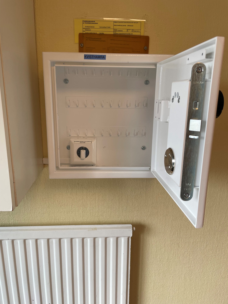 Direkt till vänster innanför entrédörrarna sitter ett taggskåp. I taggskåpet sitter en timer och en nyckelknippa.