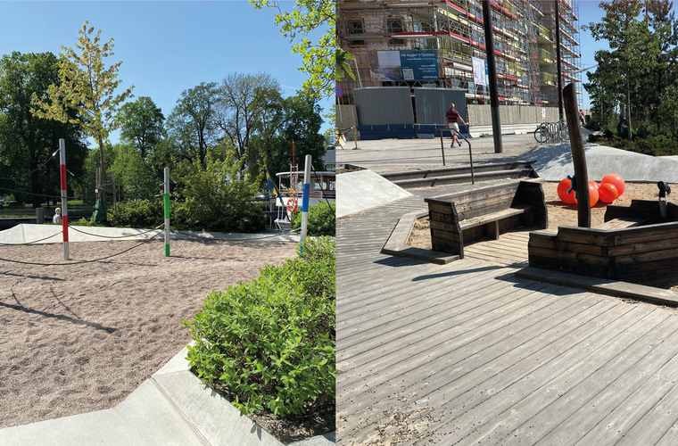 Längs med kajen i Norrtälje hamn finns två lekytor. Den första har en klätterställning och den andra har en yta med sandlek för de lite mindre barnen