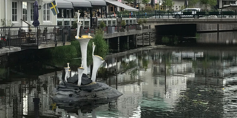 Det här flytande skulpturala verket var tillverkat i cellplast och färgad betong. I första anblicken kan denna svampbevuxna ö vara en fantasieggande och ganska läcker syn. Vita trumpetliknande tentakler tycks spränga sig upp ur en guldglimmande årsring i urberget men som titeln antyder tycks något inte stå rätt till. Det är ur gamla krackelerande trattar och spruckna jordlager som de krympande generationerna stretar sig fram. I bakvattnet av mänsklig utvecklingssträvan och storskalig industrialisering har ju värdefulla resurser börjat sina och själva jordsystemet har rubbats med oöverblickbara konsekvenser till följd. Människan har tillskansat sig sådan makt att ansvar och ödmjukhet behöver följa, inte minst för de utsatta i framtidens mångfald. Som så ofta i Oscar Furbackens konst utgår gestaltningen från en naturskildring av ett litet förunderligt ekosystem. Vissa lavsampar av släktet Cladonia kan nämligen föryngra sig genom att skjuta upp nya små trattar ovanpå varandra. Nerlagt i naturen, inte minst i svampriket, finns det hoppfulla inslag att begrunda i mörka tider. Och i sommar får Norrtäljeåns utlopp representera det livgivande vatten som håller världen flytande i en nyckfull epok.