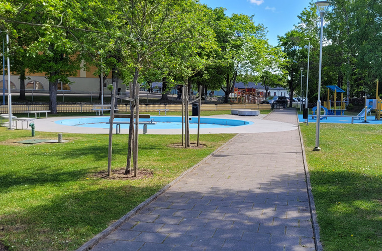 En park där det finns både en plaskdamm och en lekplats. Runt plaskdammen finns sittplatser. Här finns även blommande prydnadsträd som till exempel magnolia.