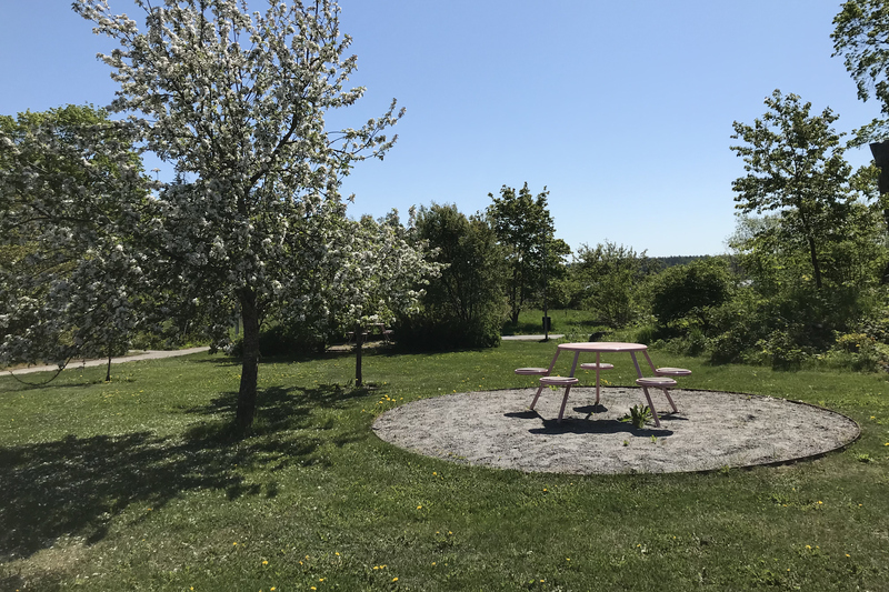 - Sittplatser: Det finns tre platser med bord och stolar. Två har grus som underlag, medan den tredje är placerad på en gräsyta.