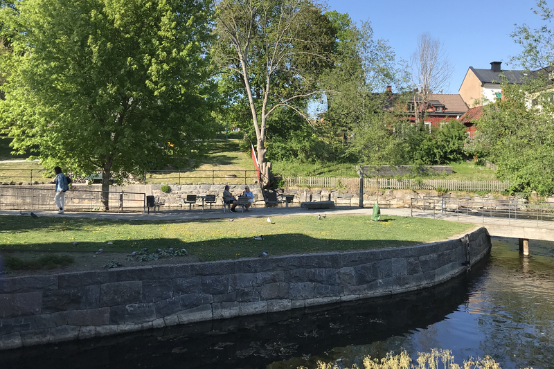 Parken är bilägen mitt i Norrtälje i Norrtäljeån vid de gamla dammluckorna.