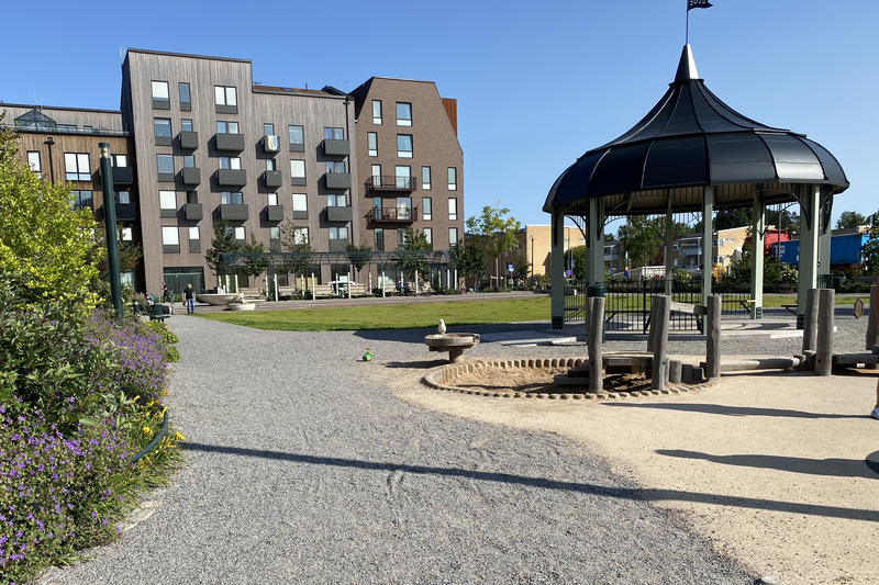 - Finns här: Lekplats, pergola, lusthus, konstverk, sittplatser, tillgänglighetsanpassad toalett