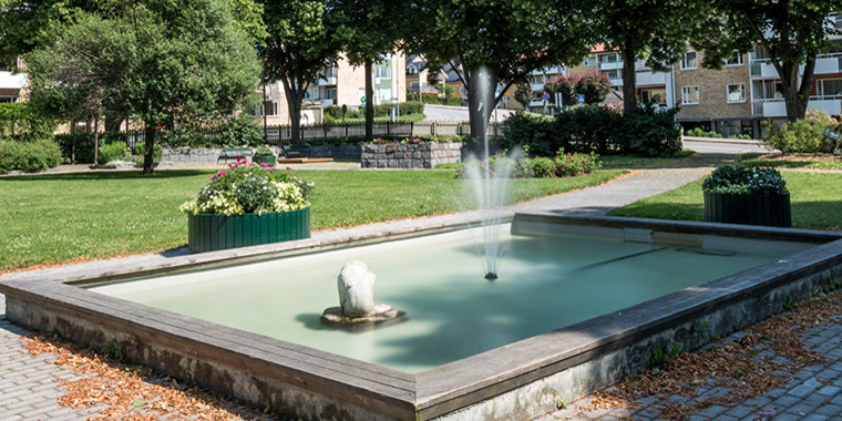 Parken byggdes under 1940-talet och ritades av en känd landskapsarkitekt vid namn Ulla Bodorff. Vid parkens kanter står stora lövträd som ger både skugga och avgränsning mot gatorna runt parken. I parken finns flera perenn- och buskplanteringar som blommar från vår till höst. Det finns möjlighet till att grilla och ha picknick. På sommaren finns vattenspel i form av en fontän/bassäng. Under kvällstid är parken och de stora träden belysta.